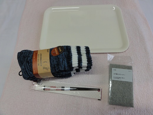 今回は「食器トレー」「冬物靴下」「箸」「コゲ取りクリーナー」の4点。